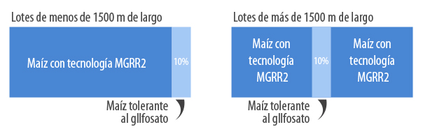 • El Refugio debe sembrarse en bloque en uno de los bordes del lote y en caso de que el lote mida más de 1.500 m de lado, el bloque de refugio deberá sembrarse en el centro. Esto se realiza para asegurarse que los insectos del refugio puedan volar y cruzarse con cualquier potencial sobreviviente del maíz Bt.